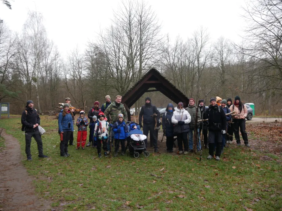 Poprzedniego dnia uczestniczyłam w ciekawym szkoleniu pn. Rezerwat Biosfery – Puszcza Kampinoska w ramach projektu realizowanego przez prezeskę Datajany, Dorotę Długaszek, adresowanym tym razem do kadry PTTK-owskiej. Upewniłam się podczas szkolenia, że do Puszczy trzeba ruszać z własnym chrustem, jeśli chce się rozpalić ognisko na którejś z polan rekreacyjnych (wcześniej uzyskując zgodę na jego rozpalenie w Dyrekcji KPN i wnosząc odpowiednią, niewysoką opłatę). Uprzedziłam o tym uczestników, których na starcie w Truskawiu stawiło się 23 i rozpoczęliśmy spacer od zebrania i przytroczenia do bagaży chrustu, zebranego poza terenem Puszczy – przed przekroczeniem jej granicy. Zwolniony z tego obowiązku był tylko najmłodszy uczestnik, dziewięciomiesięczny synek jednego z uczestników, który przechadzkę odbywał w wózku spacerowym.