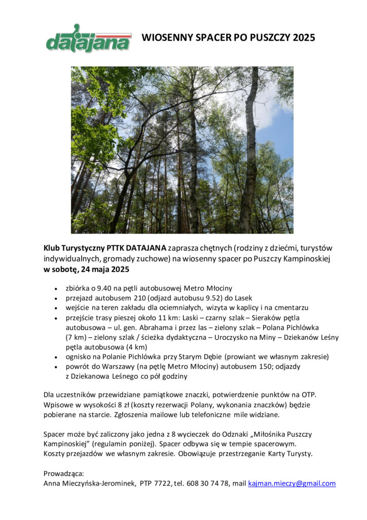 Klub Turystyczny PTTK DATAJANA zaprasza chętnych (rodziny z dziećmi, turystów indywidualnych, gromady zuchowe) na wiosenny spacer po Puszczy Kampinoskiej w sobotę, 24 maja 2025.